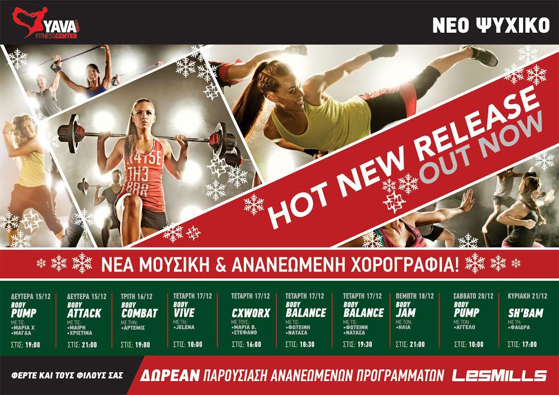 Όλα τα πρωτοποριακά προγράμματα της LesMills περιμένουν να τα γνωρίσεις! Yava Πετρούπολης BODY PUMP - Δευτέρα 15/12 στις 18:00 BODY ATTACK - Τρίτη 16/12 στις 20:00 BODY COMBAT - Πέμπτη 18/12 στις 18:00 BODY BALANCE - Πέμπτη 18/12 στις 10:00 SH'BAM - Παρασκευή 19/12 στις 21:00 Yava Περιστερίου BODY COMBAT - Δευτέρα 15/12 στις 19:00 BODY...
